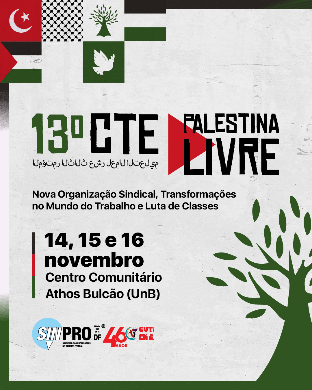 O 13º Congresso dos Trabalhadores em Educação (CTE) terá o nome “Palestina Livre”. A decisão é da comissão organizadora, que entende a luta contra a violação dos direitos humanos e pela autodeterminação dos povos princípios de uma educação crítica, libertária e que atua para a emancipação de todas e todos. O congresso será realizado nos dias 14, 15 e 16 de novembro, no Centro Comunitário Athos Bulcão da Universidade de Brasília (UnB).
