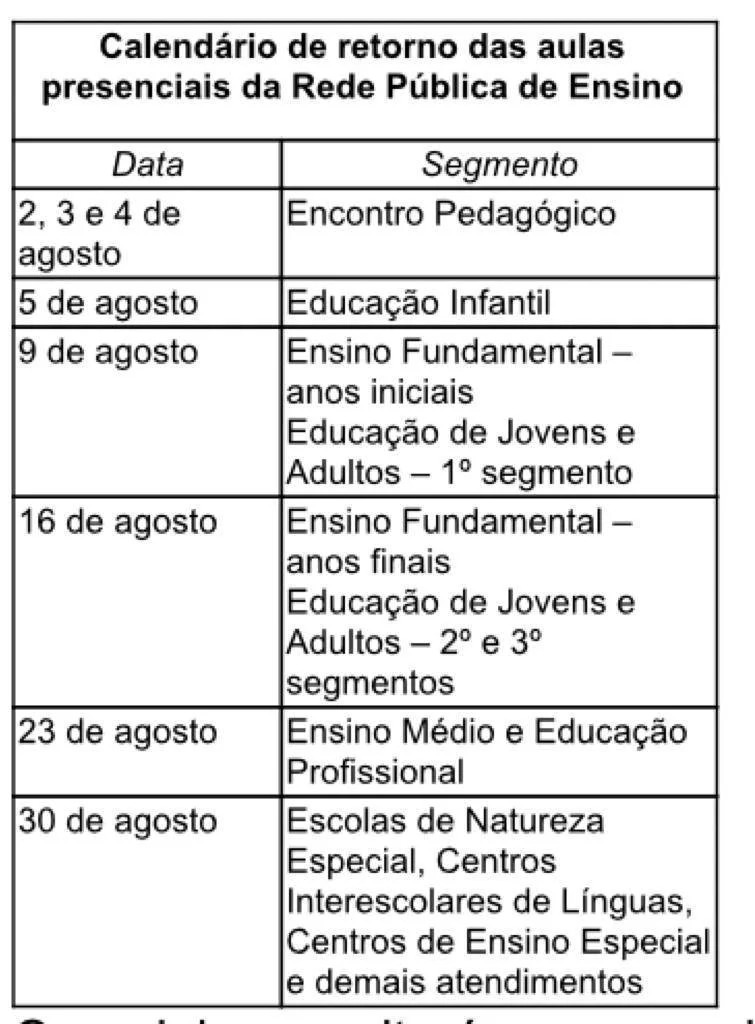 Nos dias 2, 3 e 4 de agosto, a categoria participará de um encontro pedagógico. Na quinta-feira (05), retorna a Educação Infantil. Na próxima segunda-feira (09) será a vez do Ensino Fundamental – anos iniciais, e Educação de Jovens e Adultos (EJA) – 1º segmento. No dia 16 de agosto voltam o Ensino Fundamental – anos finais, e a Educação de Jovens e Adultos (EJA) – 2º e 3º segmentos. Já no dia 23 de agosto será a vez do Ensino Médio e da Educação Profissional. Para finalizar, dia 30 de agosto voltam Escolas de Natureza Especial, Centros Interescolares de Línguas, Centros de Ensino Especial e demais atendimentos.