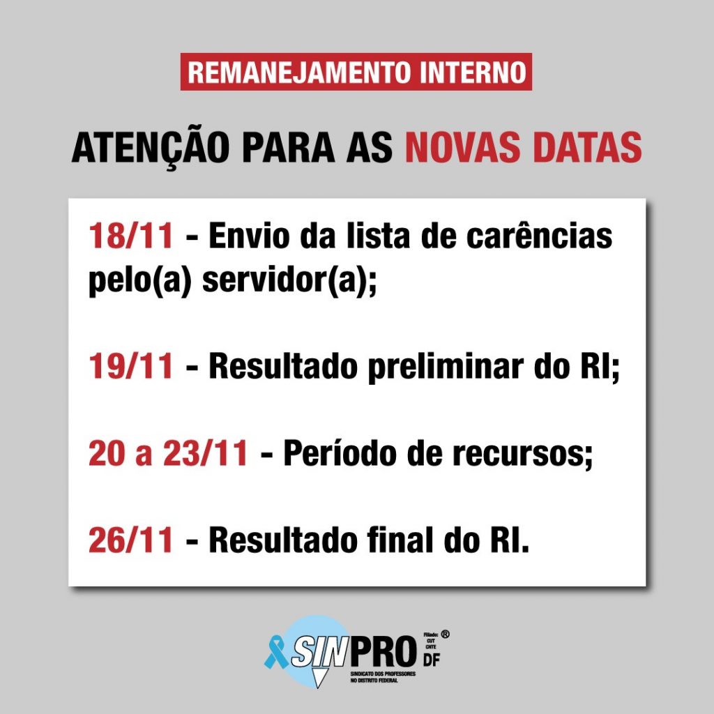 A diretoria colegiada do Sinpro-DF informa que houve ampliação de prazos para o remanejamento interno. Atenção às novas datas: