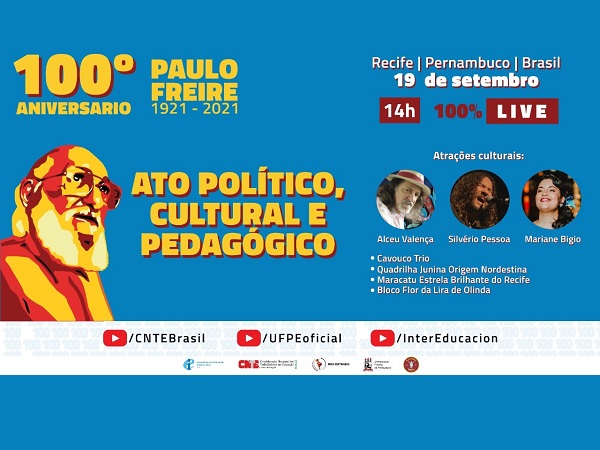 O centenário do educador pernambucano Paulo Freire, que em 19 de setembro de 2021 completaria 100 anos, será comemorado virtualmente com muita alegria e cultura popular. Uma dezena de instituições do movimento educacional brasileiro e internacional promovem, nos dias 19 e 20 de setembro, o 100º Aniversário de Paulo Freire em evento virtual. A live será composta de ato político, pedagógico e cultural, com a apresentação do cantor pernambucano Alceu Valença, às 18h do dia 19.