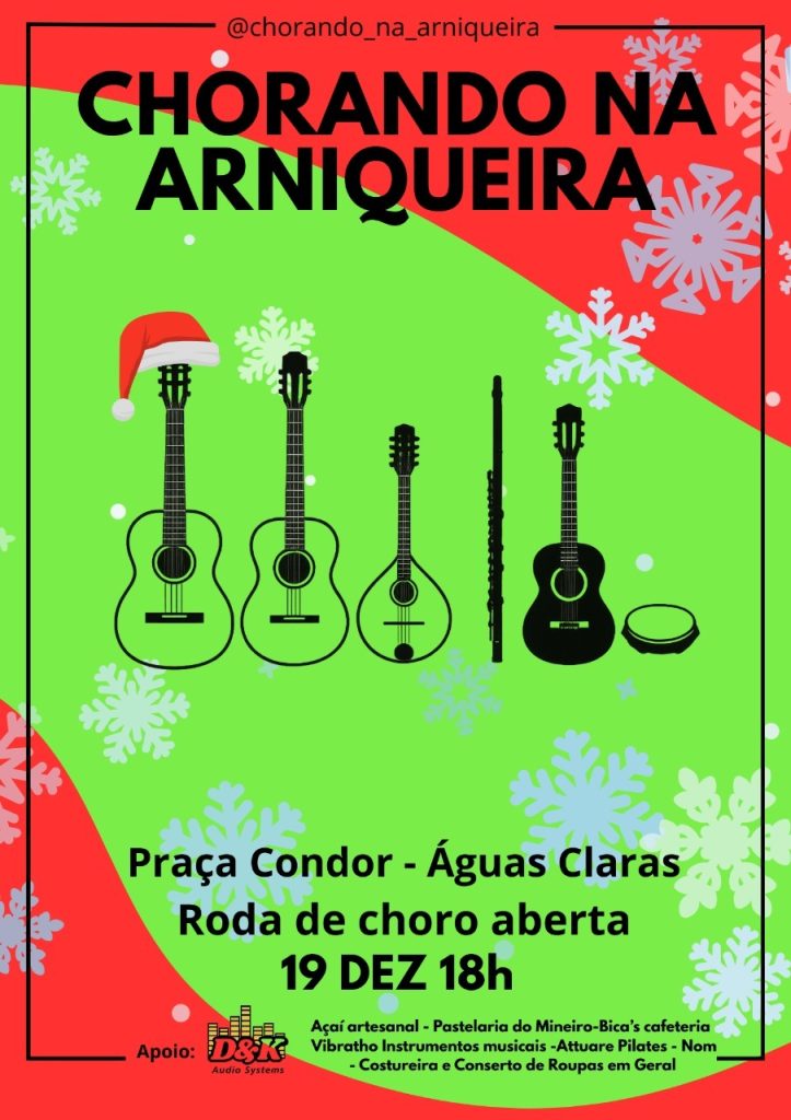 Nesta sexta-feira (19/12) o(a) brasiliense poderá conferir mais um ‘Chorando na Arniqueira’. O projeto é iniciativa de um professor aposentado da rede pública de ensino, que leva música, alegria e convívio à praça Condor, próximo à Estação Arniqueiras, em Águas Claras. Toda terceira sexta-feira de cada mês, Rinaldo Paceli de Oliveira e Vera Lúcia Werneck realizam o projeto, uma autêntica roda de choro que reúne músicos e apreciadores do gênero.