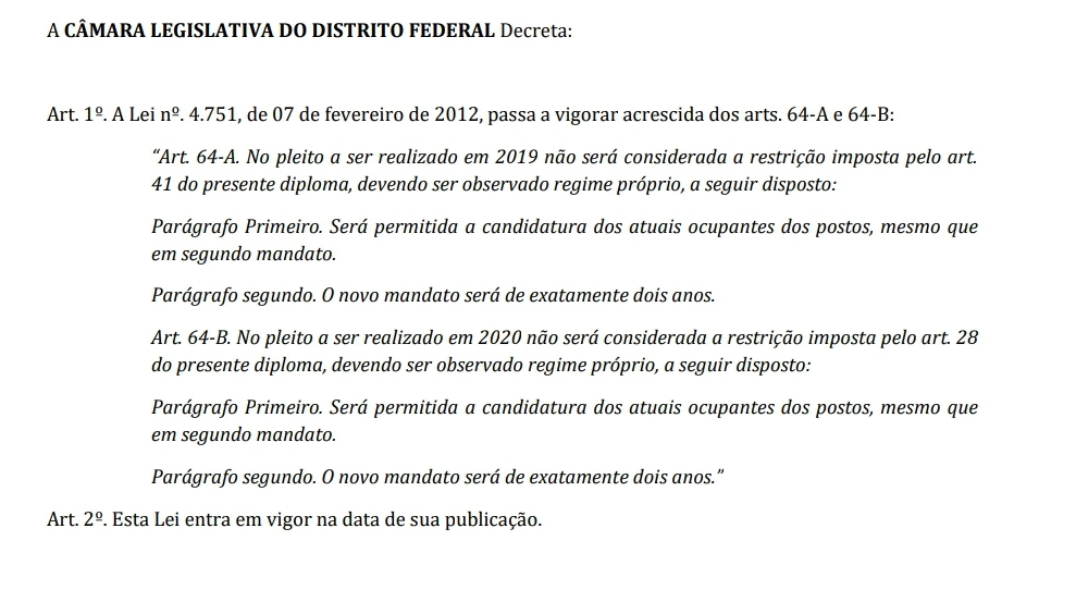 A mudança autoriza que as atuais direções participem novamente do pleito em 2019 e ainda reduz de três para dois anos o mandato de diretores e vices das escolas do DF. O projeto foi aprovado em dois turnos e segue agora para sanção do governador Ibaneis Rocha (MDB). O PL também trata das eleições para conselhos escolares, constituídos por representantes de pais, estudantes, professores e auxiliares. Nesses casos, o processo de escolha passa a utilizar as regras estabelecidas para os diretores e vices. Vale ressaltar que em 2020 a gestão democrática será revisada conforme determina a lei do Plano Distrital de Educação, sendo assim, novas mudanças poderão ocorrer.