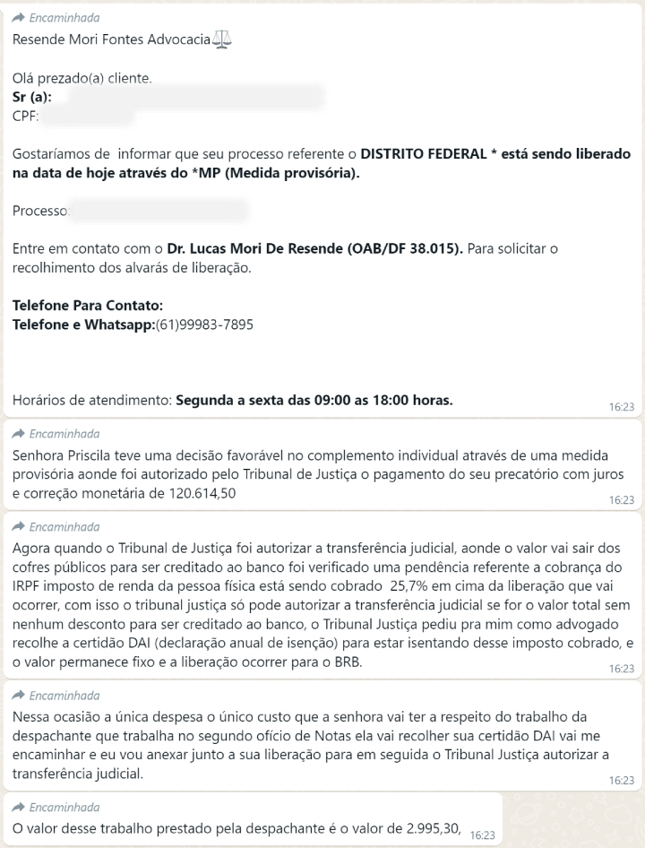 Uma mensagem enviada por WhatsApp, com foto de perfil com a marca do Sinpro, por um número que não é do sindicato, (61) 99872-4892, informa sobre o assunto: LIBERAÇÃO DO PRECATÓRIO EM FASE DE PAGAMENTO EM REGIME ESPECIAL, com os nomes dos advogados Drª Maria Rosali Barros ou Dr. Lucas Mori, indicando os números (61) 4042-0924 | WhatsApp: (61) 99840-3650 como contatos. Ao final, os golpistas colocam a observação falsa de que o sindicato não está atendendo presencialmente, em virtude os período pandêmico. Fique atento(a)! Isso é golpe! O Sinpro-DF está atendendo, normalmente, de forma presencial, das 8h às 17h, nas sedes e subsedes.