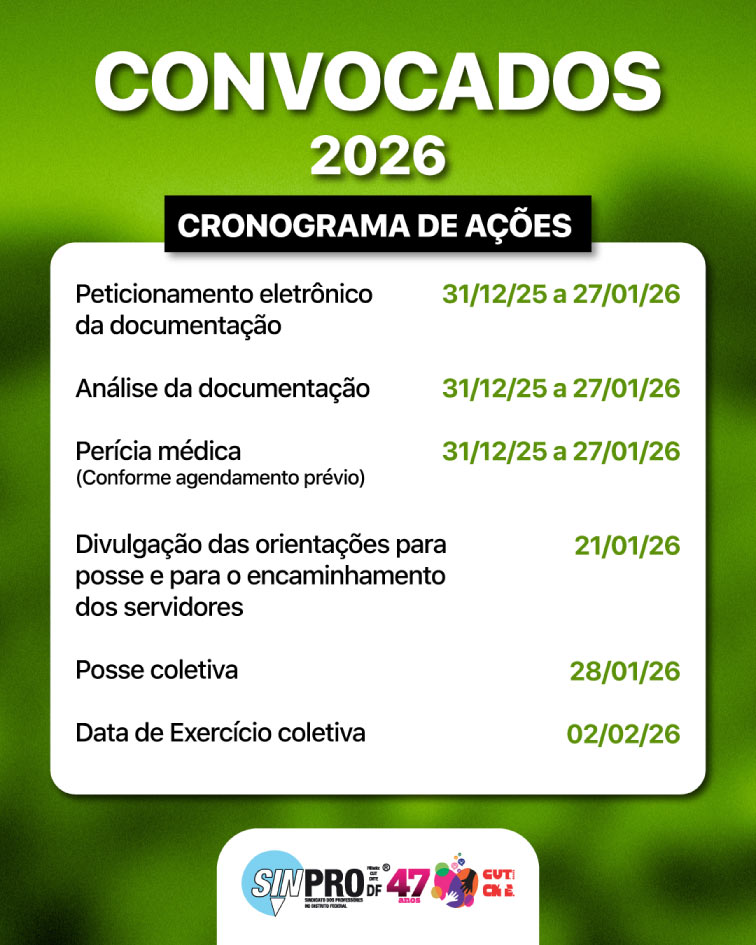 31/12/2025 a 27/01/2026 – É o período para que o(a) convocado(a) efetue a perícia médica mediante agendamento e o peticionamento eletrônico da documentação, e a SEEDF faça a análise dessa documentação.