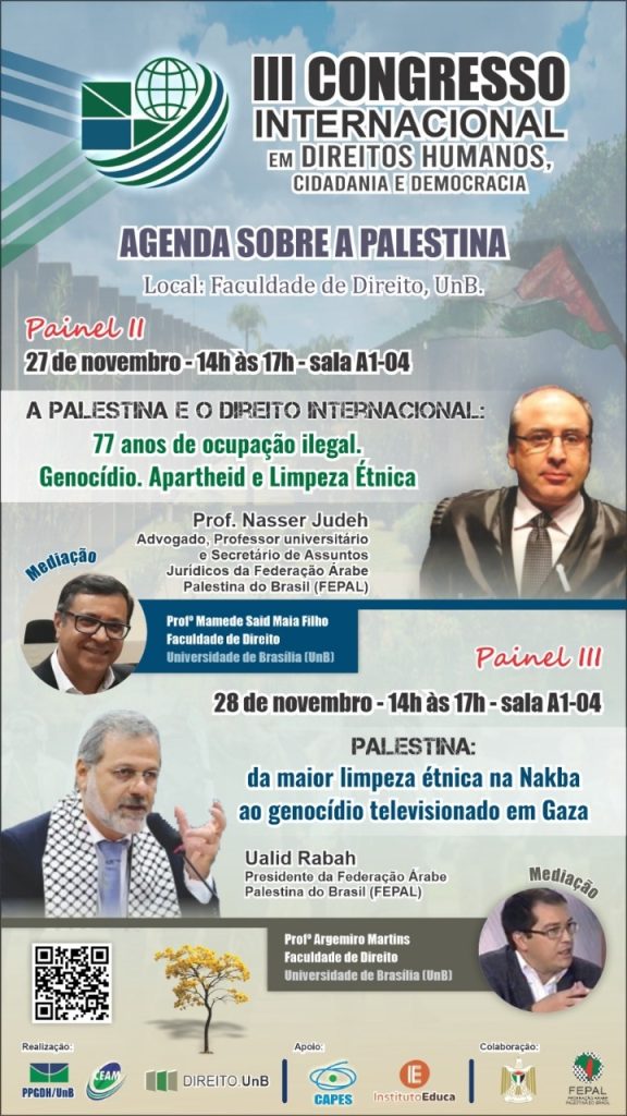 O encerramento será marcado pelo Ato de Solidariedade Internacional ao Povo Palestino, com participação de representantes da Federação Árabe Palestina do Brasil (FEPAL), lideranças acadêmicas e parlamentares. A leitura da Carta em Defesa dos Direitos Humanos e da Democracia selará o compromisso coletivo reforçado ao longo do Congresso.