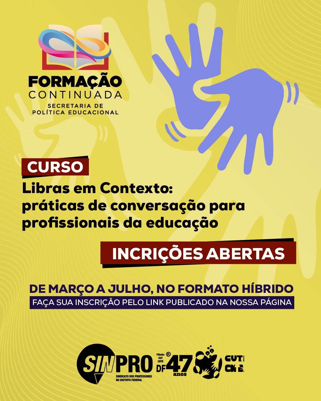 A partir deste sábado (21), professores(as) e orientadores(as) educacionais efetivos(as) ou em regime de contratação temporária, da ativa ou aposentados(as), poderão fazer a inscrição para o curso “Libras em Contexto: práticas de conversação para profissionais da educação”. O curso, oferecido pela Secretaria de Política Educacional do Sinpro, é exclusivo para filiados(as). As inscrições são gratuitas e o(a) interessado(a) deverá comprovar, por meio de certificado, que possui habilitação do curso de libras em nível intermediário ou equivalente.