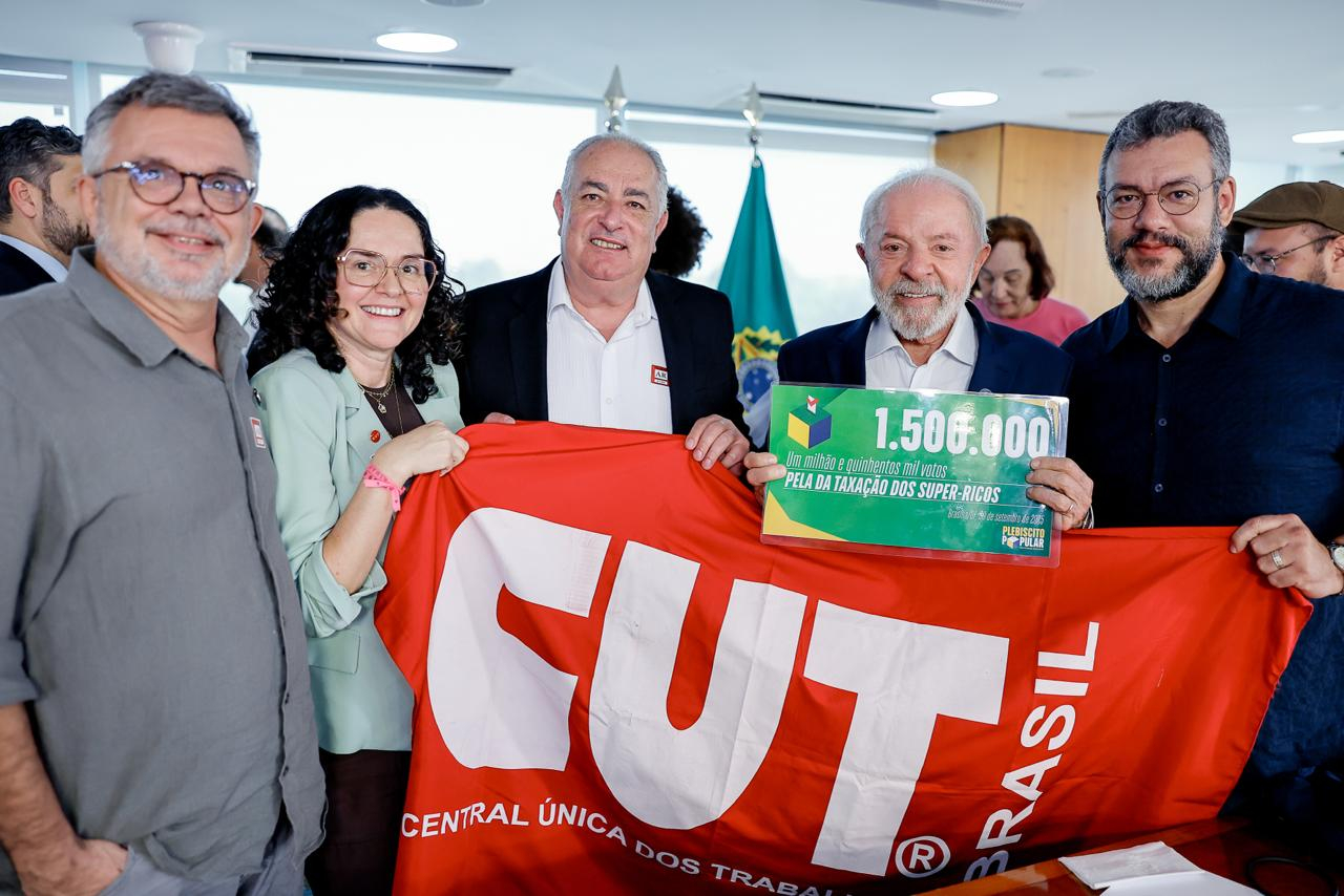 Ele destacou que a entrega simbólica dos 1,5 milhão de votos reforça a importância do plebiscito: “Entregamos para ele uma representação dos 1,5 milhão de votos que pede a isenção de imposto de renda para quem ganha até cinco mil reais e que os super-ricos paguem o imposto necessário para cobrir essa despesa”.