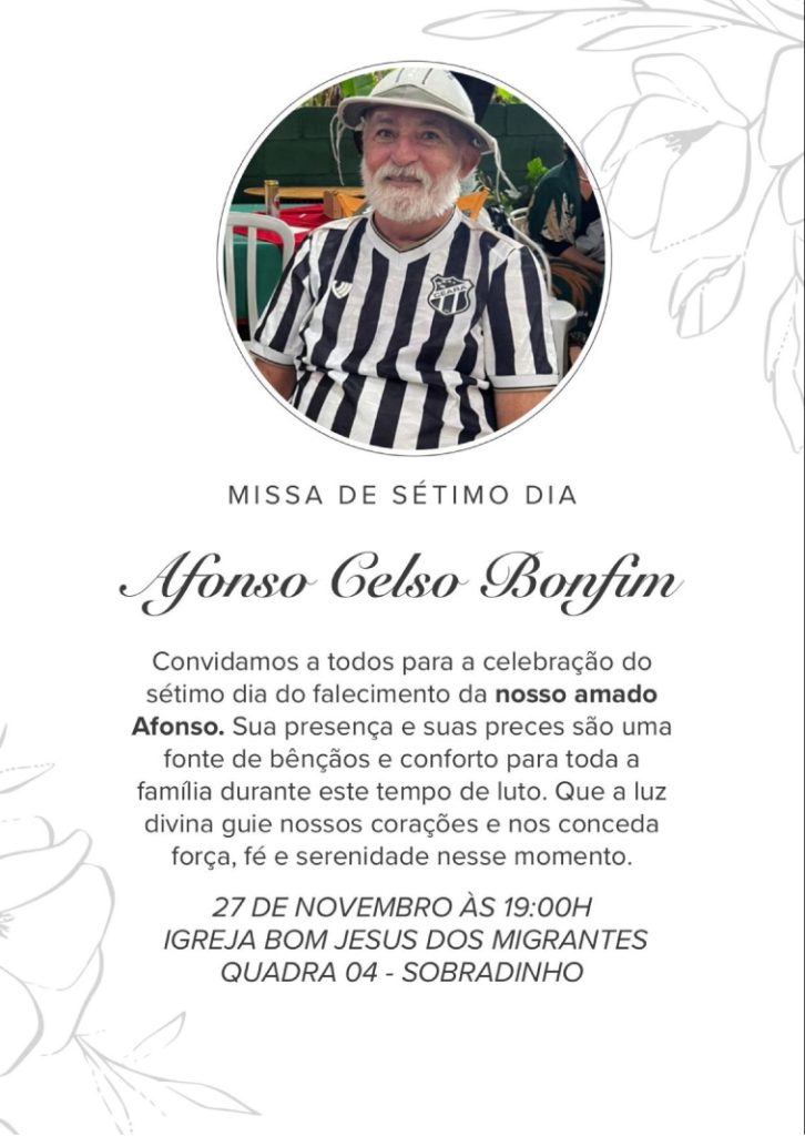 O velório de Afonso Celso foi no último dia 23 de novembro. O corpo seguiu para sepultamento em Crateús (CE), sua terra natal. A missa de sétimo dia ocorre nesta quinta-feira (27/11) às 19h, na Igreja Bom Jesus dos Imigrantes, na qd 04 de Sobradinho.