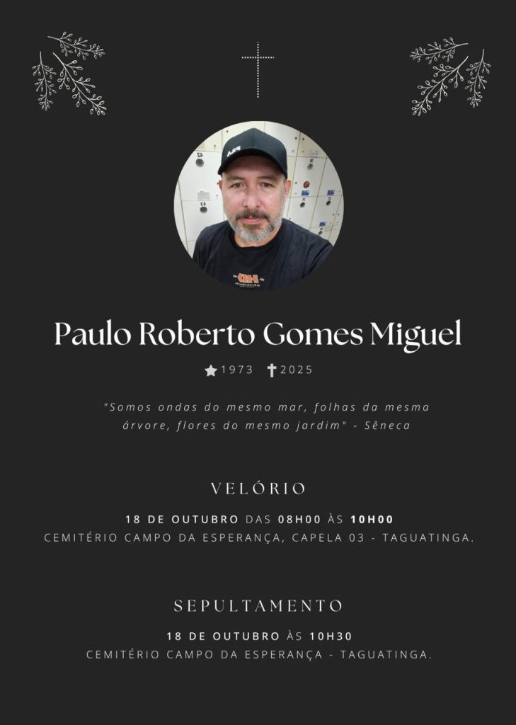 É com profundo pesar que o Sinpro comunica o falecimento do professor Paulo Roberto Gomes Miguel, nesta quinta-feira (16/10). Servidor dedicado da Secretaria de Educação do DF (SEEDF) desde 1998, lecionou Matemática em várias instituições, incluindo os Centros de Ensino Fundamental 40 de Ceilândia e 308 de Santa Maria, o Centro de Ensino Médio 417 de Santa Maria e, mais recentemente, no Centro Educacional 01 de Brasília.