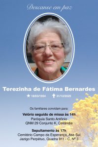 O velório e a missa acontecem hoje, 1º de janeiro, das 14h às 16h, na Paróquia Santo Antônio, QNM 29, conjunto K, em Ceilândia. O sepultamento será às 17h, no Cemitério Campo da Esperança, Jazigo Perpétuo, Quadra 911 – C, N° 3, na Asa Sul.