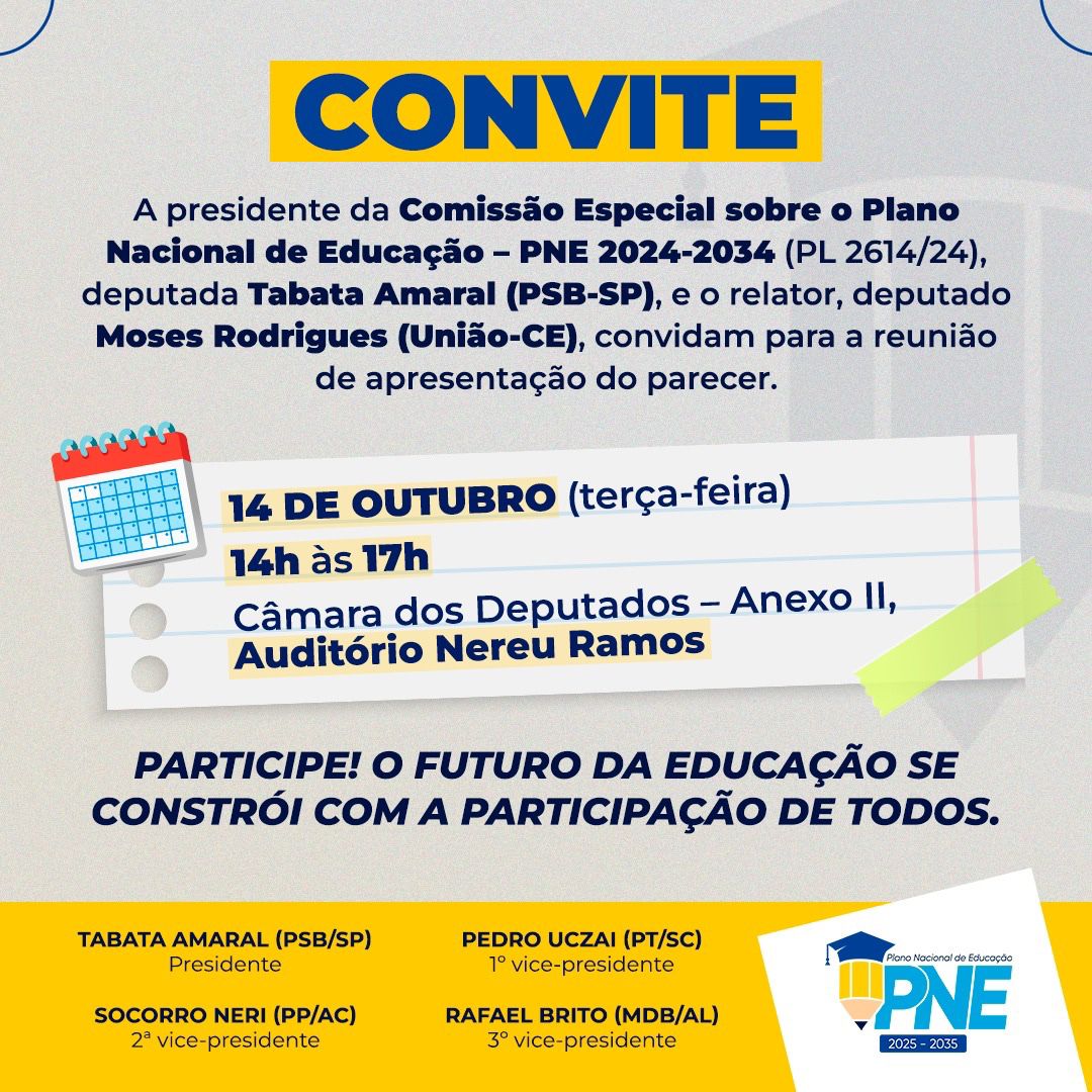 O evento contará com a participação do ministro da Educação, Camilo Santana, do presidente da Câmara, Hugo Motta, e de outras lideranças políticas e sindicais. No encontro, também será apresentado um estudo inédito sobre os custos para implementação do novo PNE, com olhar detalhado sobre o que significam todas as metas.