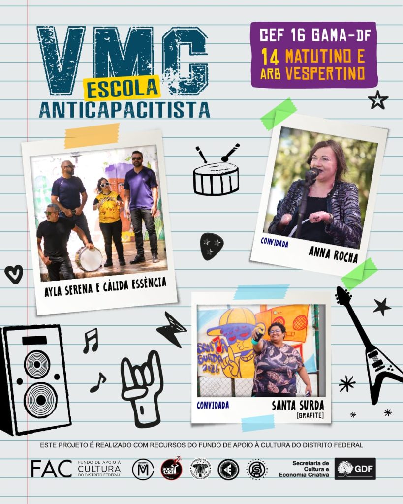 O projeto ‘Vivências da Música no Cognitivo (VMC) Escola Anticapacitista’ encerra sua circulação pelo Gama nesta quinta-feira (16/4), na Escola Classe 18, celebrando um marco histórico. A iniciativa, que deve atingir um público total de mais de mil alunos(as), utiliza o rock, o circo e o grafite para fortalecer a luta anticapacitista e promover o protagonismo de artistas com deficiência (PCD) no ambiente escolar.