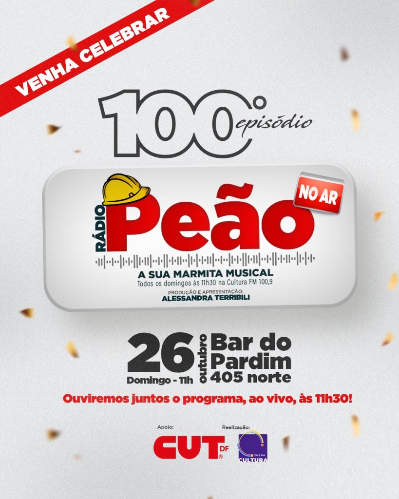 No ar pela Cultura FM Brasília desde dezembro de 2023, a Rádio Peão chega ao seu 100º episódio neste domingo, 26 de outubro. Para celebrar, os realizadores do programa receberão parceiros e ouvintes no Bar Pardim (405 norte) a partir de 11h, para uma audição coletiva do programa especial.