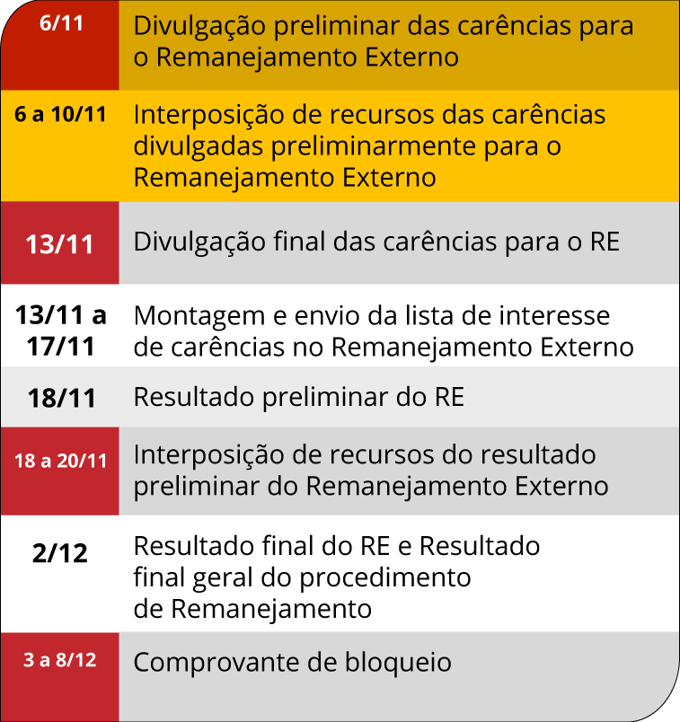 O resultado final geral do processo de remanejamento está previsto para o dia 2 de dezembro, e o comprovante de bloqueio deverá ser efetuado de 3 a 8 de dezembro.