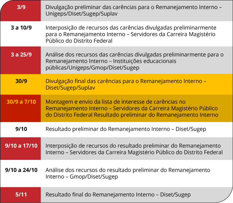 Atenção às datas do remanejamento! A partir desta terça-feira (30/09) A SEEDF divulga a lista final de carências para o Remanejamento Interno, e cabe aos(às) servidores(as) montar, até a próxima terça-feira (7/10) sua lista de prioridades.