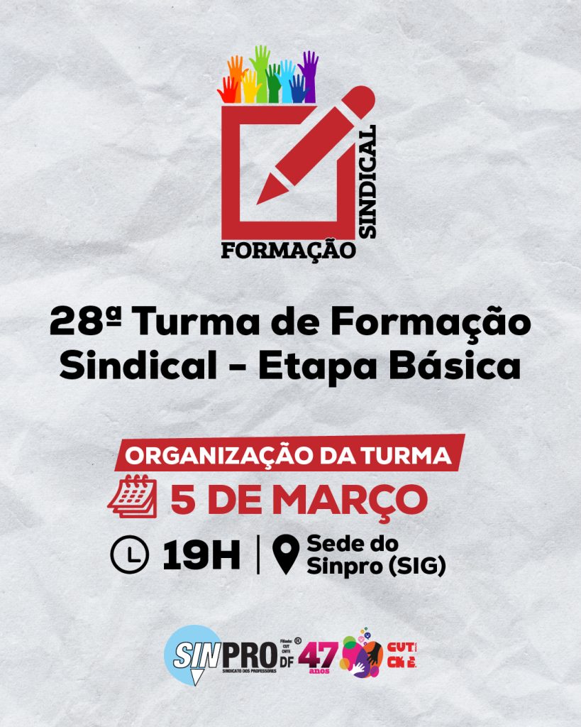 O Sinpro realizará, no dia 5 de março, a 28ª turma de Formação Sindical Básica do Sinpro no auditório do sindicato (SIG). A atividade é gratuita, gera certificado de formação continuada pela Secretaria de Educação do DF e é exclusiva para professores(as) e orientadores(as) educacionais filiados(as) ao Sinpro.