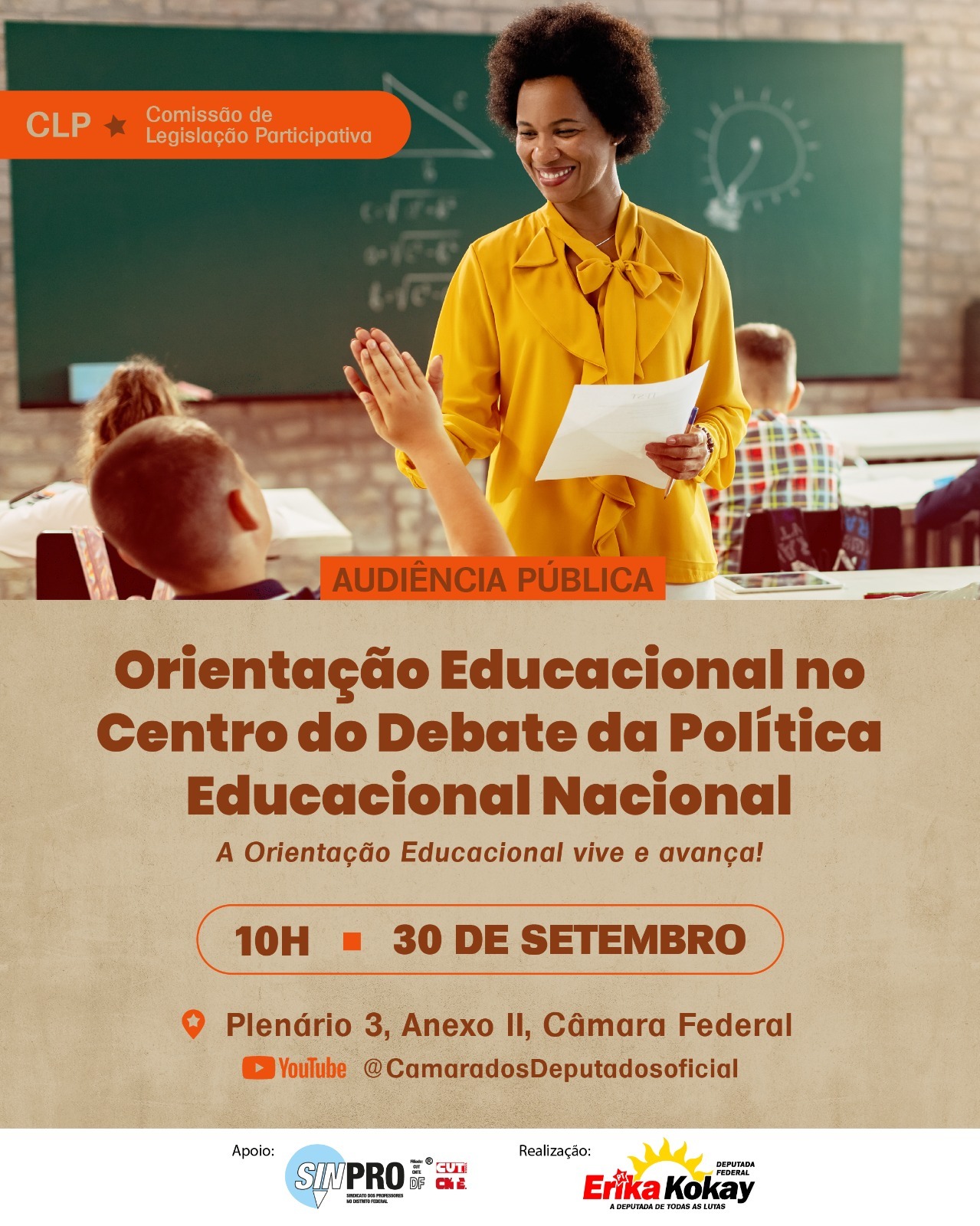 A contribuição dos(as) orientadores(as) educacionais no contexto da Política Educacional Nacional será tema de audiência pública nesta terça-feira (30), às 10h, no Plenário 3, Anexo II da Câmara dos Deputados. A atividade foi proposta pela deputada federal Erika Kokay (PT-DF) e traz como tema “A Orientação Educacional Vive e Avança”.
