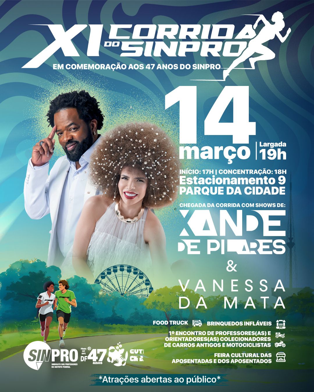 Os 47 anos do Sinpro-DF será comemorado em grande estilo, com Xande de Pilares e Vanessa da Mata, que farão o encerramento da XI Corrida do Sinpro. A atividade será dia 14 de março, a partir das 17h, no estacionamento 9 do Parque da Cidade. Os shows são gratuitos e abertos ao público.